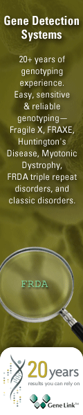 The GenemerTM product line is PCR based. The product includes a specific primer pair for gene or mutation specific amplification. Genemer products are available for the gene fragment and disorders listed. Specialized optimized conditions may be required for certain triple repeat disorder amplifications. The GenemerTM kit is a complete easy-to-use kit for reliable genotyping of a gene fragment. The product includes a specific primer pair for gene or mutation specific amplification, optimized buffers and dNTPs and in most cases, control DNA. These kits contain specialized and optimized conditions that are required for amplification of large repeats in certain triple repeat disorder amplifications. Gene Link recommends these GenemerTM kits for researchers who have not established their own optimized amplification conditions. GenemerTM kits are also available for conventional radioactive-based detection methods. A Radioactive component is not present in these kits. Gene Link strongly recommends the use of non-radioactive gene detection systems. Consider switching to Gene Link's product line of non-radioactive detection systems. Gene Link's PCRProberTM Kit is based on PCR amplification followed by Southern blot chemiluminescent detection using an alkaline phosphatase labeled oligonucleotide probe. This kit is a safe and sensitive alternate to radioactive-based detection methods. The amplified products are resolved on a sequencing polyacrylamide gel, and then blotted and processed for chemiluminescent detection. The PCRProberTM Kit is simple and robust for routine triple repeat detection of greater than 100 repeats of all triple repeat disorders listed, except Fragile X. The CGG repeat in Fragile X can be detected up to ~50 repeats. The GeneProberTM product line is based on the chemiluminescent Southern blot detection method. Gene Link's non-radioactive detection systems for genotyping of triple repeat disorders are rapid, reliable and as sensitive as the 32P labeled southern blots. No more decayed probes and radioactive exposure. Kits are available for reliable genotyping of the fragile X, myotonic dystrophy and other triple repeat mutation group disorders. Unlabeled GeneProberTM probes are also available for radio labeling and radioactive based detection. Gene Link strongly recommends the use of non-radioactive gene detection systems. Consider switching to Gene Link's product line of non-radioactive detection systems. Gene Link's GScanTM gene detection kits are safe, convenient and sensitive, and afford automated compilation of data. The kits contain optimized PCR amplification reagents and a wide array of fluorescent-labeled primers for genotyping after PCR using fluorescent genetic analyzer instrument(s). Included in these kits are ready-to-run control samples of various repeats of the triple repeat disorder kit. These control samples are for calibration with the molecular weight markers for accurate size determination of the amplified fragments. The GScan kits are simple and robust for routine triple-repeat detection of greater than 100 repeats of all triple repeat disorders listed, except Fragile X. The CGG repeat in Fragile X can be detected up to ~50 repeats. These are cloned fragment of the mutation region of a particular gene for use with gene or mutation specific Genemer? and GScanTM products. These control DNAs are ideal genotyping templates for optimizing and performing control amplification with unknown DNA. |