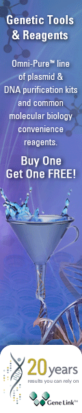 Genetic Tools & ReagentsGene Link presents a product line of high quality kits for the molecular biology laboratory. The Omni-ReagentsTM series have been designed and thoroughly tested for performance and exceed most comparable products in ease of use, quality and yield. Gene Link offers a variety of DNA and RNA purification and concentration systems. Each system has been optimized for reproducible and consistent results, yielding ultra high quality DNA and RNA suitable for all molecular biology applications. The Omni-CleanTM system provides optimized reagents for rapid extraction of DNA from agarose gels, and for routine concentration of DNA. The DNA is concentrated, purified and completely salt-free. The Omni-CleanTM DNA concentration system is a time saving and inexpensive alternate to routine ethanol precipitation. Omni-PureTM Plasmid Purification System Routine mini-preps of plasmid extraction are made even easier with consistent performance. Purification can be performed with a maximum of 3 ml of cells yielding up to 20 µg of purified DNA. The convenient spin column method can be scaled up by using multiple columns and processed in less than 30 minutes. The purified DNA is of high quality suitable for all molecular biology applications including direct use in fluorescent automated sequencing methods. Omni-PureTM Genomic DNA Purification System The Omni-PureTM Genomic DNA purification system is designed for convenience and consistency. It is a universal genomic DNA purification system. Ultra pure genomic DNA can be purified from small amounts of almost all known sample types and sources. Samples from human blood, bodily fluids, animal and plant tissue and microbial and viral sources have been purified using the Omni-PureTM Genomic DNA purification system. One purification is usually sufficient to yield enough DNA for all molecular biology applications. Gene Link provides a convenient source of high quality first strand cDNA prepared from freshly obtained tissue and appropriately frozen during transportation. First strand cDNA is useful for amplifying a particular cDNA using PCR. A unique blend of amplified high quality mRNA purified from various tissues. Omni-mRNATM pooled reference mRNA is compatible with all commercially available labeling systems. Other applications of pooled reference mRNA include RNA ELISA, Quantigene, HPSA, and a number of other RNA amplification/detection systems. Omni-mRNATM pooled reference mRNA size distribution is from ~5 kb to 200 bp. These can also be used for cloning mRNA of interest by RTPCR. Universal and Low unlabeled DNA markers contain a blend of fragments ranging from 50 base pairs to 10 kb. The universal contains fragments of the following sizes; 10 kb, 8 kb, 6 kb, 4 kb, 3 kb, 2 kb, 1.55 kb, 1.4 kb, 1 kb, 750 bp, 500 bp, and 400 bp. The "low" version contains fragments from 50 bp to 2 kb. The low Omni-MarkerTM is ideal for routine PCR gels. A loading of 5 µl is sufficient per lane.